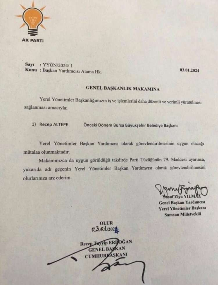 Bursa Büyükşehir Belediyesi başkanlığı görevini 30 Mart 2009 - 23 Ekim 2017 tarihleri arasında yürüten Recep Altepe, Cumhurbaşkanı Recep Tayyip Erdoğan'ın isteği üzerine istifa etmişti. 31 Mart 2024 Pazar günü yapılacak Mahalli İdareler Seçimleri öncesinde yaşanan gelişmeyle Altepe, AK Parti Yerel Yönetimler Başkanı Yusuf Ziya Yılmaz'ın yardımcılığına getirildi.
