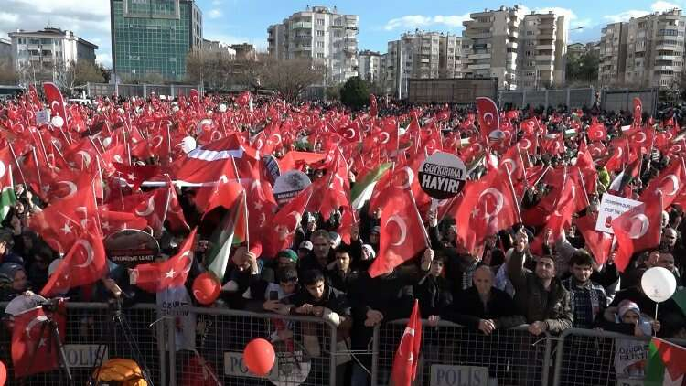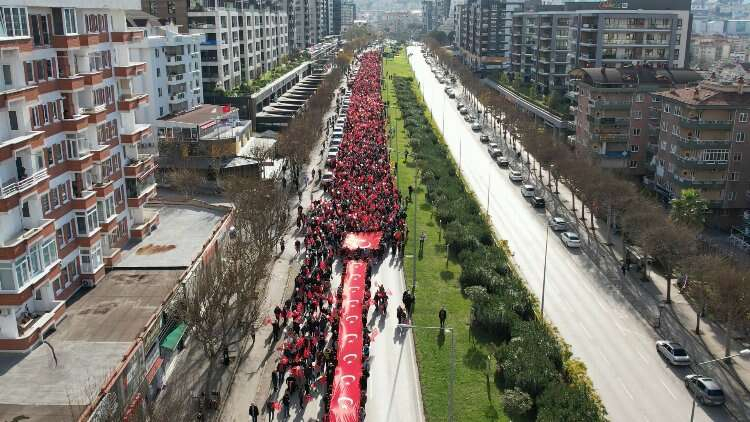 Filistin'e Destek Platformu'nun organize ettiği, Bursa Gönüllü Kuruluşlar Platformu'nun desteklediği programda, yaklaşık 30 bin kişi Nilüfer ilçesindeki Fatih Sultan Mehmet Bulvarı'nda bir araya geldi. Ellerinde Türk ve Filistin bayraklarıyla alana gelen vatandaşlar, İsrail'i ve terör örgütü PKK'yı lanetleyen sloganlar attı, dövizler açtı.