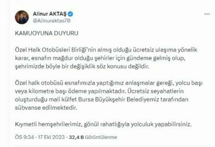 Bursa Büyükşehir Belediye Başkanı Alinur Aktaş, Tüm Özel Halk Otobüsleri Birliği'nin aldığı ücretsiz ulaşım kararına yönelik açıklamalarda bulundu.