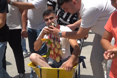 Bursa'da Onur ve Sude Naz Sayar çifti dünyaevine girdi, damat gelenek gereği arkadaşlarının ilginç “eziyeti”yle unutulmaz anlar yaşadı. Kıyafetleri kesilen damat, el arabasıyla gezdirildi, köy meydanında duş aldırıldı.