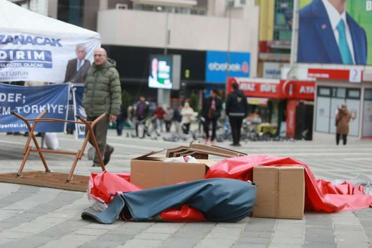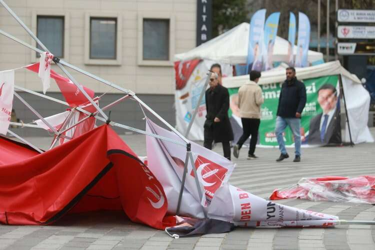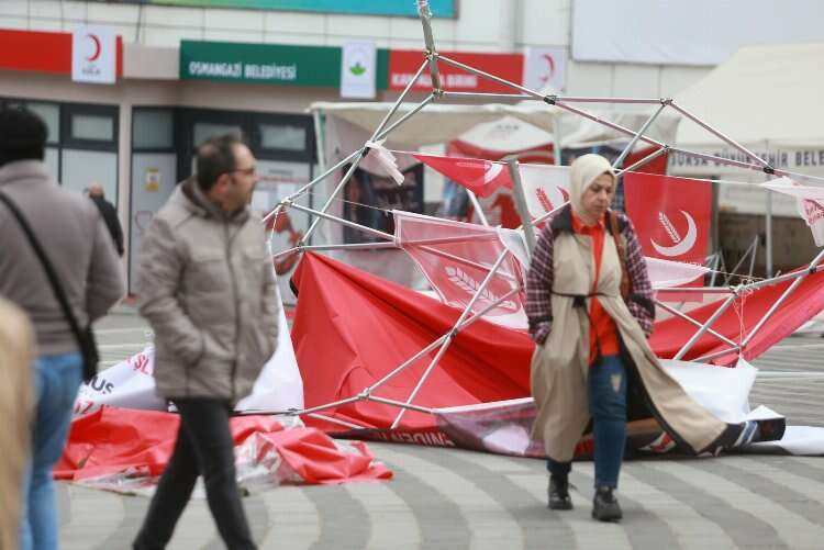 Ayrıca, Bursa 15 Temmuz Demokrasi Meydanı’nda 31 Mart Yerel Seçimleri için çalışma yapan bazı siyasi parti stantlarının rüzgara dayanamayarak yerle bir oldu.