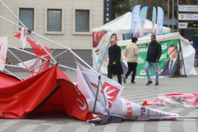 Bursa’da dün geceden beri etkili olan fırtına, şehir merkezinde 15 Temmuz Demokrasi Meydanı'nda kurulan parti stantlarını yerle bir etti.
