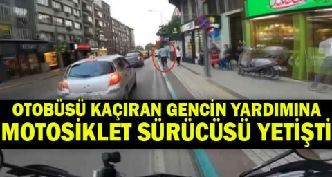 Bursa'da kartına para yüklediği sırada belediye otobüsünü kaçıran gencin yardımına motosiklet sürücüsü yetişti. Motosiklet sürücüsü, otobüsü kaçıran genci bir sonraki durağa kadar götürerek kaçırdığı otobüse binmesini sağladı. O anlar, sürücünün kask kamerasına yansıdı.