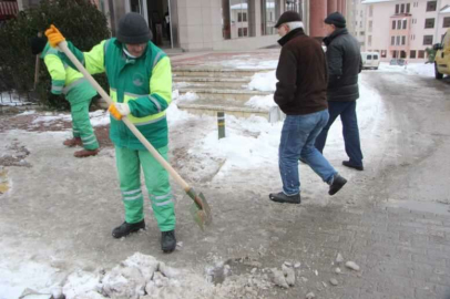 Bursa'da yoğun kar yağışı sonrası buzlanan kaldırımlar belediye ekiplerince temizlendi.