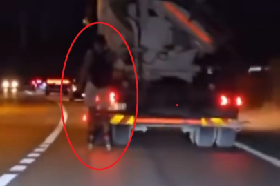 Bursa'da patenli gencin, çimento kamyonunun arkasına tutunarak yaptığı tehlikeli yolculuğu kameraya yansıdı.