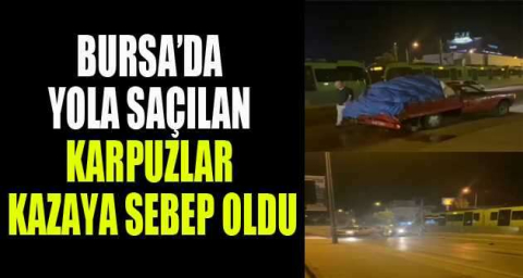 Bursa’da kamyonetin kasasında yüklü karpuzlar yola saçılarak kazaya sebep oldu. Kaza anı cep telefonu kamerasına yansıdı.