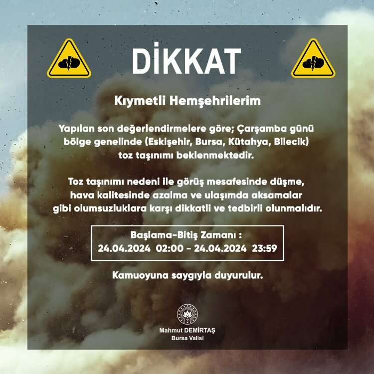Bu gece 23:59’a kadar sürmesi beklenen meteorolojik olayla ilgili şu ifadelere yer verildi: "Yapılan son değerlendirmelere göre; Çarşamba günü bölge genelinde (Eskişehir, Bursa, Kütahya, Bilecik) toz taşınımı beklenmektedir. Toz taşınımı nedeni ile görüş mesafesinde düşme, hava kalitesinde azalma ve ulaşımda aksamalar gibi olumsuzluklara karşı dikkatli ve tedbirli olunmalıdır."