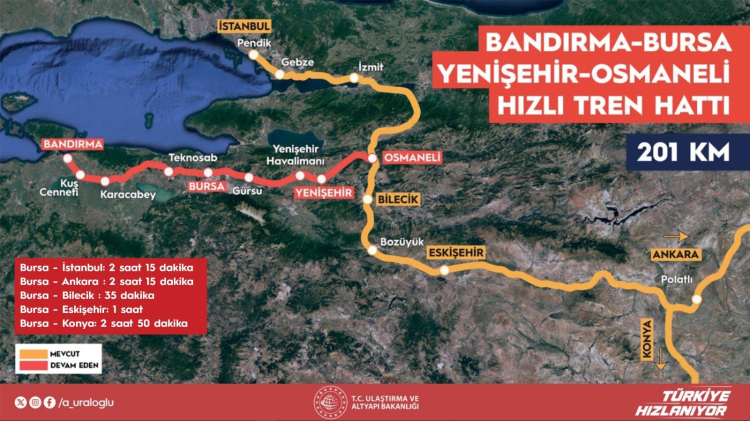 Bakan Uraloğlu’nun Osmaneli-Bursa arası yüksek hızlı tren hattının önümüzdeki yıl hizmete açılacağını, projenin tamamının ise 2028 yılı sonuna kadar bitirileceğini açıklamasına da değinen Gürkan, "Bakanımızın liderliğinde, bakanlık yetkililerimizin yoğun gayreti ile yürütülen Bursa-Ankara hızlı tren hattında seferler 2026 yılının ortasında başlayacak. Bu, kentimizin ulaşım altyapısında çok büyük bir dönüm noktası olacak" ifadelerini kullandı.