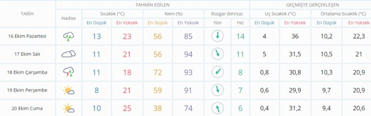 Ülkemiz genelinin parçalı ve çok bulutlu, Marmara, Karadeniz, Doğu Anadolu'nun kuzeyi ve doğusu ile Adana'nın ve Hatay'ın kıyı kesimlerinin sağanak yağışlı geçeceği tahmin ediliyor. Yağışların, Karadeniz kıyı kesimi ile Sakarya, Van, Ağrı ve Bitlis çevrelerinde yerel olarak kuvvetli olması bekleniyor. Doğu Anadolu'nun güneydoğusu ile Güneydoğu Anadolu'nun doğusunda toz taşınımı görüleceği tahmin ediliyor.