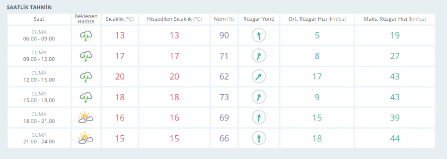 Parçalı ve çok bulutlu, kıyı kesimleri ile Manisa çevrelerinin yerel olmak üzere sağanak yağışlı geçeceği tahmin ediliyor. Yağışların, İzmir'in kuzey kesimlerinde öğle saatlerinden sonra yer yer kuvvetli olması bekleniyor. Rüzgarın, Kuzey Ege kıyılarında öğle saatlerinden sonra güney yönlerden kuvvetli (40-70 Km/saat) olarak eseceği tahmin ediliyor.