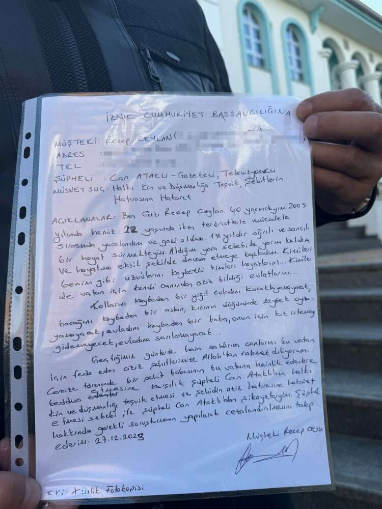 2005 yılında Diyarbakır’da vatani görevini yaptığı sırada PKK terör örgütünün saldırısında yaralanarak gazi olan Recep Ceylan, İznik Adliyesinde Can Ataklı hakkında ‘halkı kin ve düşmanlığa teşvik, şehitlerin hatırasına hakaret’ suçlarından dava açtı. Adliye önünde açıklama yapan Ceylan, "Kendini gazeteci olarak tanıtan şahıs, şehit babasına hakaret etmiştir. Ben bir gazi olarak duyarsız kalmak istemiyorum. Bu şahıs hakkında şikayetçi oluyorum. Bütün vatandaşlarımızın da Hz. İbrahim'in ateşine su taşıyan karınca olmasını istiyorum" dedi.