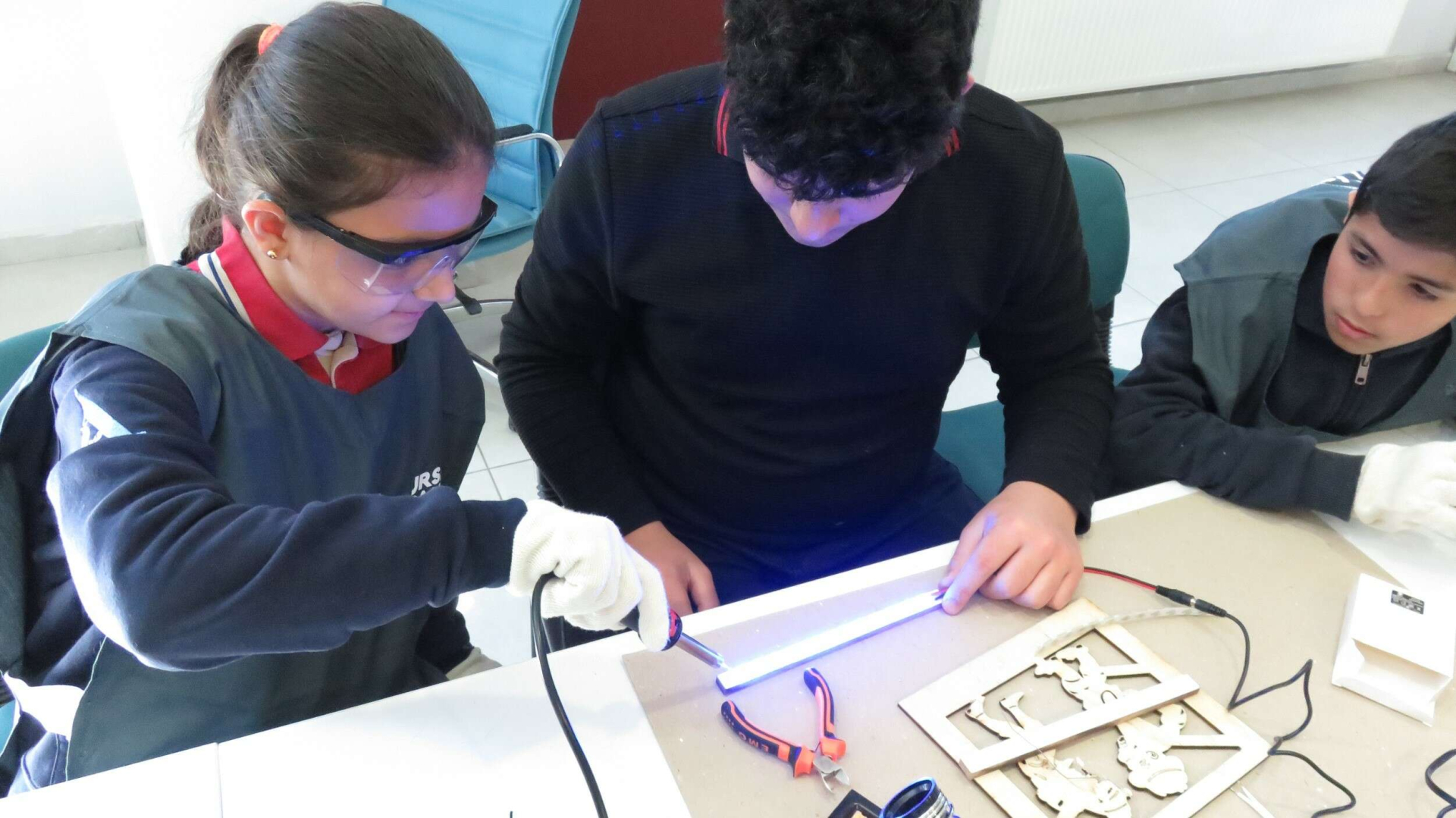 Depremin etkili olduğu şehirlerden Bursa’ya gelerek eğitim hayatlarını Nilüfer Azizsancar Ortaokulu’nda sürdüren 15 öğrenci, Büyükşehir Belediyesi ve Demirtaşpaşa MTAL Okulu işbirliğiyle düzenlenen etkinlik çerçevesinde BTM’yi ziyaret etti. Bursa’nın sembolü olan Hacivat ve Karagöz figürlü ahşap duvar lambası tasarım beceri atölyesine katılan öğrenciler, el becerilerini kullanarak kendi tasarımlarını yaptı. Hayatlarında ilk defa bilim merkezi gezerek atölye çalışmasına katılan çocuklar, eğlence dolu keyifli bir gün geçirmiş oldu.