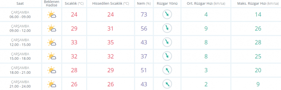 Akşam saatlerine doğru termometreler 32 derece olarak ölçülürken az bulutlu ve güneşli bir gökyüzüyle birlikte gün batımı yaşanıyor. Akşam saatlerinde de az bulutlu gökyüzüyle birlikte hava sıcaklığı 28 derece seviyelerinde ölçülüyor. Gece saatlerinde de termometreler 26 derece seviyelerinde.