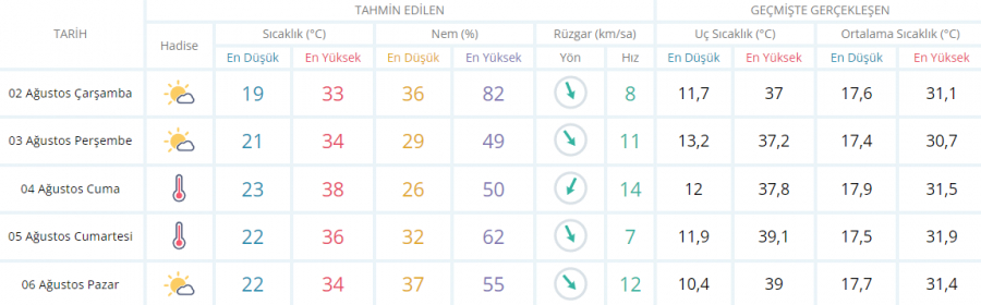 Hafta sonunun son gününde (PAZAR) yapılan tahminlere göre, sabah saatlerinde termometreler 22 derece olarak ölçülürken gün içerisinde az bulutlu ve bol güneşli gökyüzüyle birlikte termometreler 34 derecelere kadar yükseliyor.