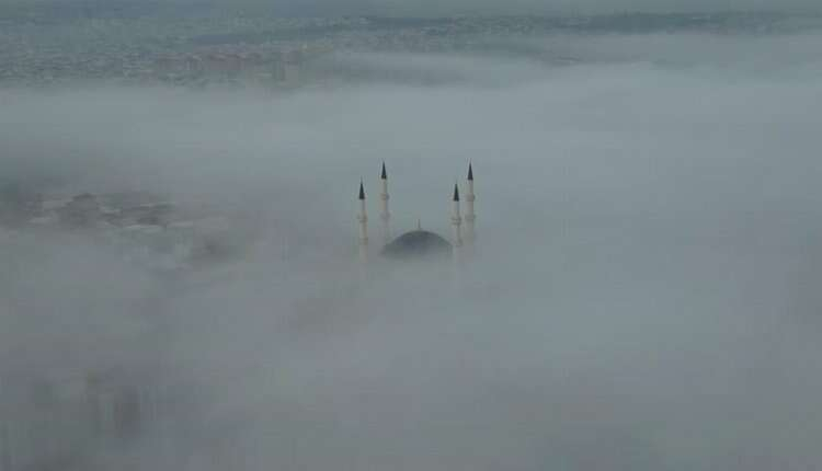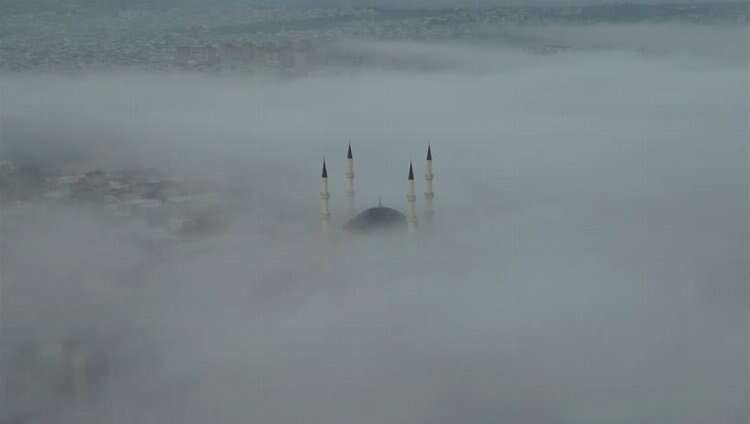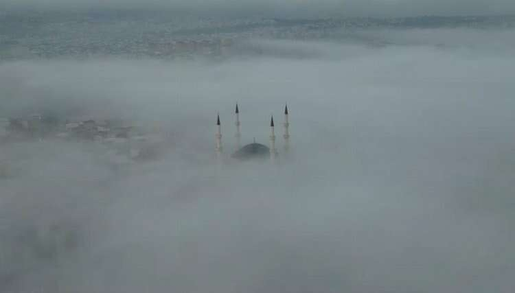 Havadan görüntülenen caminin sis nedeniyle gökyüzünde sadece minareleri görüldü.