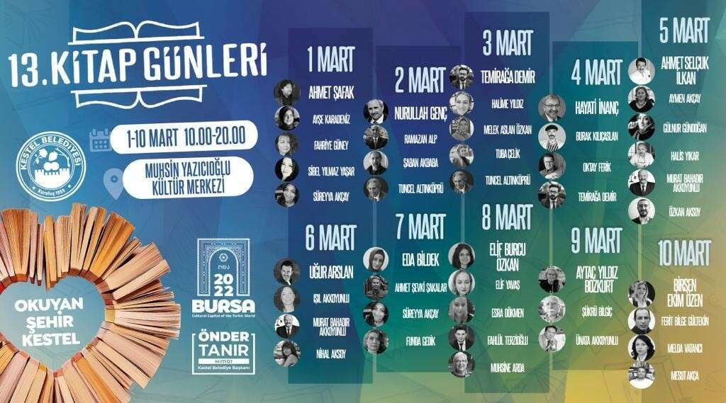 13. Kitap Günleri etkinliğinin bu yıl çok daha kapsamlı ve dolu olacağının altını çizen Kestel Belediye Başkanı Önder Tanır, "1-10 Mart tarihleri arasında 40’dan fazla yazarımız, binlerce kitabımız ve yüzlerce yayınevimiz, okuyan şehir Kestel’imizde olacak. Birbirinden değerli yazarlarımız imza günü, söyleşi ve paneller düzenleyecek. Kitapseverlerimizin sevdikleri yazarlara merak ettiklerini sorabileceği sıcak bir ortam olacak. Tüm Kestelli hemşehrilerimizi ve kitap kurtlarını 13. Kitap Günleri etkinliğine bekliyoruz’’ diye konuştu. 13. Kitap Günlerine katılacak yazar ve şairler şöyle: