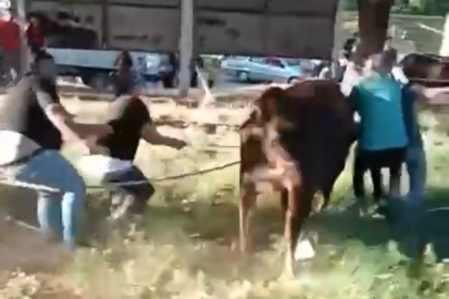 Bursa'nın Osmangazi ilçesinde bir grup aldıkları kurbanlık dananın iplerini esnek bırakınca, dana bir anda koşmaya başladı. 5 kişi danayı zapt etmek için uğraşırken, kalabalıktan ürken dana, kendisini durdurmak isteyenleri yerde sürükledi. O anlar kameraya yansıdı.