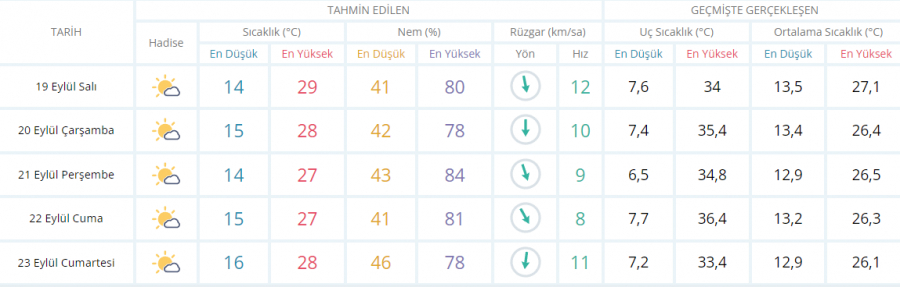 Haftanın son iş gününde ise (CUMA) sabah saatlerinde hava sıcaklığı 15 derece seviyelerinde seyrediyor. Gün içerisinde az bulutlu ve güneşli gökyüzüyle birlikte termometreler ise 27 derece seviyelerinde ölçülüyor.