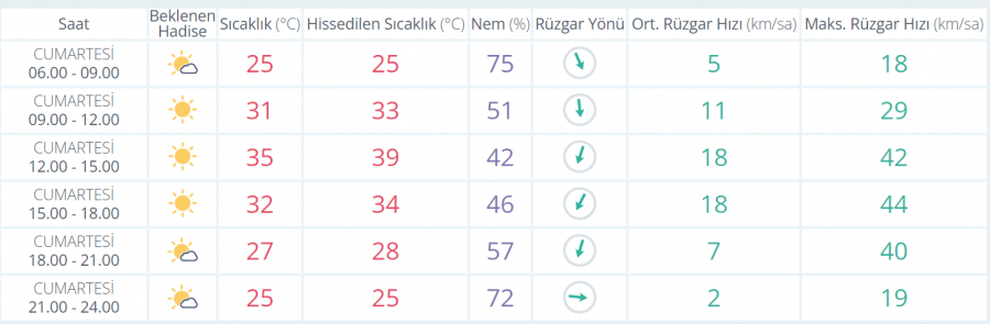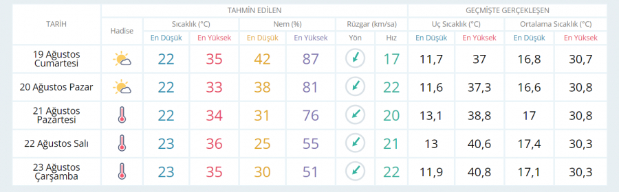 Haftanın üçüncü iş gününde ise (ÇARŞAMBA) sabah saatlerinde 23 derece olarak ölçülürken gün içerisinde açık ve bol güneşli gökyüzüyle birlikte termometreler 35 derecelere kadar tırmanıyor.