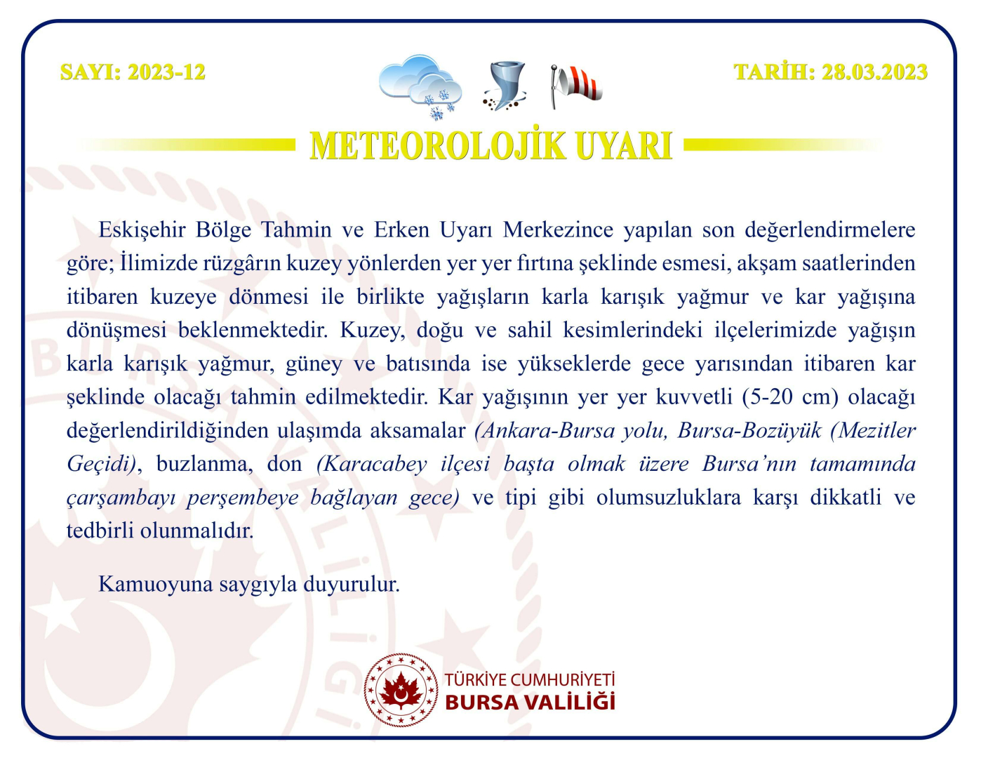 "Eskişehir Bölge Tahmin ve Erken Uyarı Merkezince yapılan son değerlendirmelere göre; ilimizin 28 Mart 2023 Salı gününden itibaren Balkanlar üzerinden gelen soğuk ve yağışlı havanın etkisine gireceği, hava sıcaklıklarının 8-15 derece azalarak mevsim normallerinin altına ineceği, soğuk havayla birlikte yağışların; ilimiz genelinde yer yer kuvvetli karla karışık yağmur ve kar şekline dönüşeceği, Çarşamba, Perşembe ve Cuma günleri ilimiz iç kesimlerinde yer yer kuvvetli olmak üzere zirai don beklendiği ayrıca rüzgârın, bugün (pazartesi) akşam saatlerinden itibaren ilimiz genelinde güney (kible) ve güneybatı (lodos) yönlerden kuvvetli rüzgâr (40-60 km/saat) ve firtina (60-80 km/saat) şeklinde eseceği, Çarşamba günü ise kuzeyli yönlerden orta, zaman zaman kuvvetli esmesi beklendiğinden, soğuk hava, yer yer etkili kar yağışları ile kuvvetli rüzgâr ve fırtınayla birlikte ulaşımda aksamalar, zirai don, buzlanma ve sağlık sorunları gibi olumsuzluklara karşı dikkatli ve tedbirli olunmalıdır.