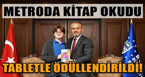 Bursa Büyükşehir Belediyesi tarafından Bursaray istasyonlarına konulan okuma kiosklarından yararlanan 50 bininci okur olan lise öğrencisi, Başkan Aktaş tarafından tabletle ödüllendirildi.