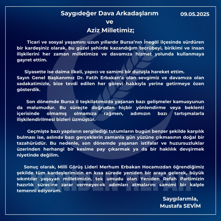 Milli Görüş hareketine bağlılığı ve Yeniden Refah Partisi Genel Başkanı Dr. Fatih Erbakan’a yakınlığıyla tanınan Bursa’nın önde gelen iş insanlarından Mustafa Sevim, son günlerde Yeniden Refah Partisi Bursa İl Teşkilatı’nda yaşanan gelişmelere ilişkin yazılı bir açıklama yayımladı.