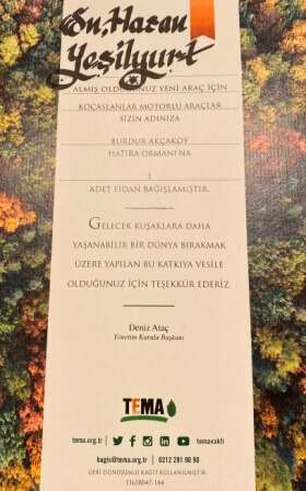 Koçaslanlar Motorlu Araçlar, alınan her elektrikli araç için Burdur Akçaköy Hatıra Ormanı’na TEMA Vakfı aracılığı ile bir adet fidan bağışlıyor.