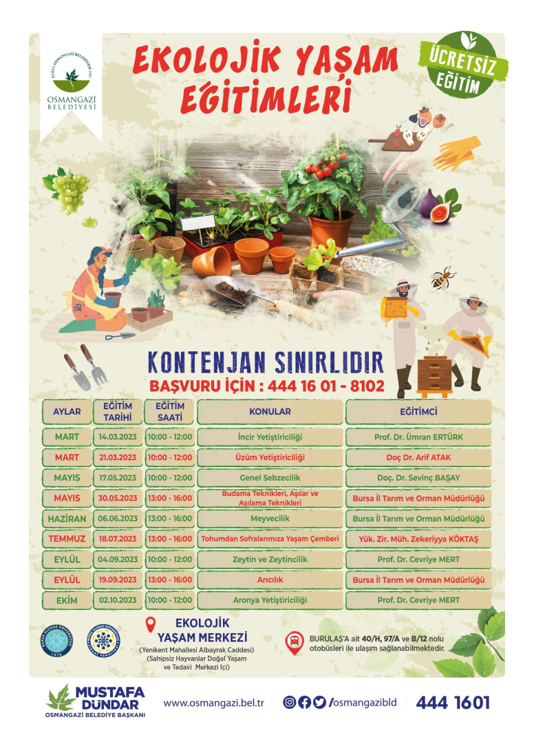 Osmangazi Belediyesi, ücretsiz olarak düzenleyeceği ‘Ekolojik Yaşam Eğitimleri’ ile incirden üzüm yetiştiriciliğine, budama tekniklerinden zeytinciliğe kadar tarımın tüm inceliklerini vatandaşlara aktaracak.