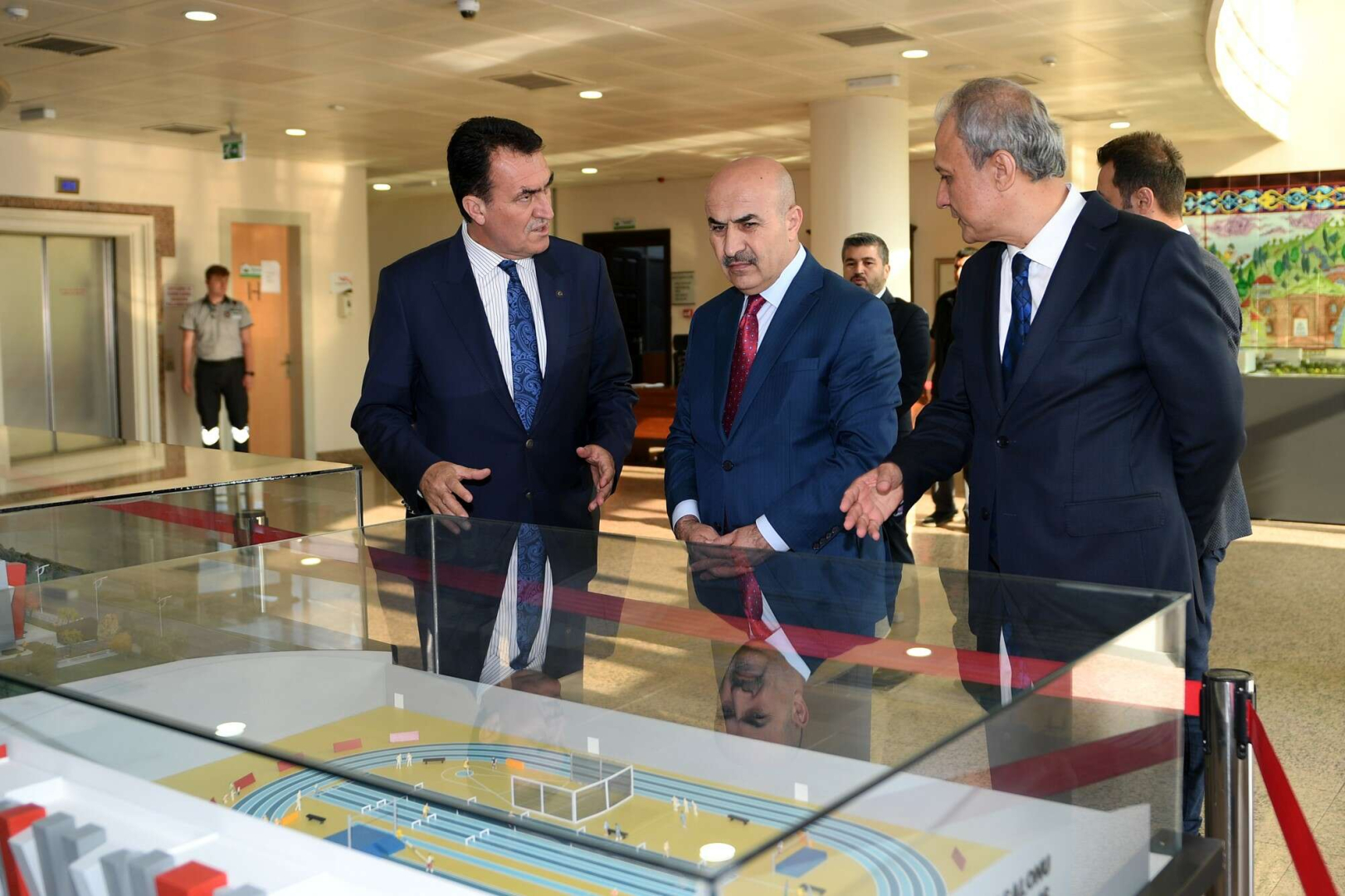 Belediye binasının girişindeki vizyon projelerin maketlerini inceleyen Vali Demirtaş’a ziyaretin anısına Başkan Dündar tarafından Orhan Gazi’nin miğferinin replikası hediye edildi.