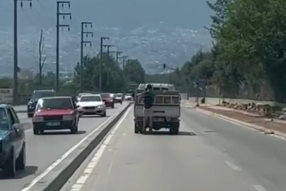 Bursa'da seyir halindeki kamyonetin kasasına tutunan bir şahıs, trafiğe aldırış etmeden yolculuk yaptı. Canını tehlikeye atan genç kameraya yansıdı.