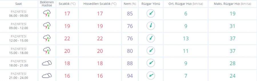 Parçalı ve çok bulutlu, doğu kesimlerinin kuvvetli olmak üzere yerel sağanak ve gök gürültülü sağanak yağışlı geçeceği tahmin ediliyor. Yağışların, Kocaeli ve Sakarya çevrelerinde yer yer çok kuvvetli ve şiddetli olması bekleniyor.