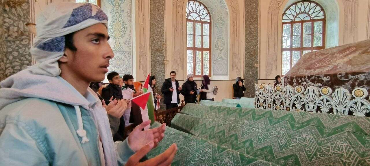 Öğrenciler, Osmanlı İmparatorluğu'nun kurucusu Osmangazi Han'ın türbesini ziyaret edip hep birlikte dua okuduktan sonra türbenin kapısında nöbet bekleyen Osmanlı Alplerinin devir teslimini izledi ve ardından da toplanan kalabalığa "Gazze’nin üzerindeki Puşide-i Siyahı Recep Tayyip Erdoğan kaldıracak" yazılı örtüleri dağıttı.