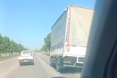 Bursa'da trafikte yan şekilde seyreden kamyon, zaman zaman devrilme tehlikesi atlattı. Diğer sürücüler gördükleri karşısında hayrete düştü.