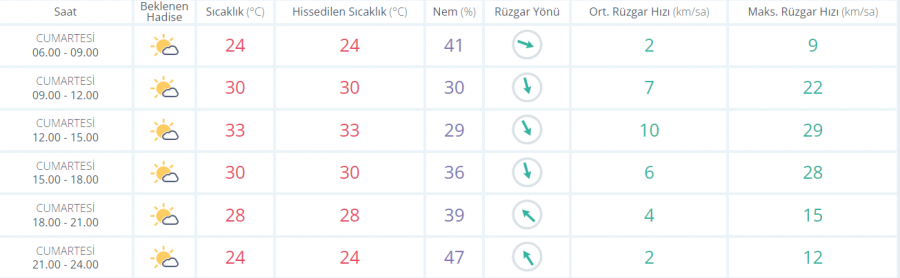 Akşam saatlerine doğru termometreler 30 derece olarak ölçülürken az bulutlu gökyüzüyle birlikte gün batımı yaşanıyor. Akşam saatlerinde de az bulutlu gökyüzüyle birlikte hava sıcaklığı 28 derece seviyelerinde ölçülüyor. Gece saatlerinde de termometreler 24 derece seviyelerinde.