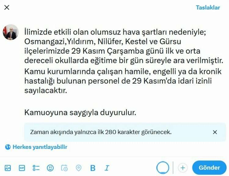 Bursa Valisi Mahmut Demirtaş tarafından yapılan açıklamada, “İlimizde etkili olan olumsuz hava şartları nedeniyle; Osmangazi, Yıldırım, Nilüfer, Kestel ve Gürsu ilçelerimizde 29 Kasım Çarşamba günü ilk ve orta dereceli okullarda eğitime bir gün süreyle ara verilmiştir. Kamu kurumlarında çalışan hamile, engelli ya da kronik hastalığı bulunan personel de 29 Kasım'da idari izinli sayılacaktır. Kamuoyuna saygıyla duyurulur” ifadelerine yer verildi.