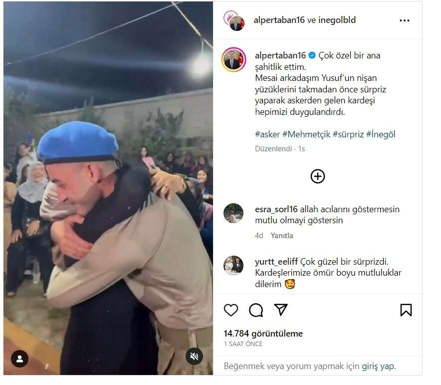 Duygulu anlar sonrası İnegöl Belediye Başkanı Alper Taban, asker kardeş ve genç çiftin yakınları ile birlikte yüzükleri kesti. Bu anı sosyal medya hesabında paylaşan İnegöl Belediye Başkanı Alper Taban, "Çok özel bir ana şahitlik ettim. Mesai arkadaşım Yusuf'un nişan yüzüklerini takmadan önce sürpriz yaparak askerden gelen kardeşi hepimizi duygulandırdı" dedi.