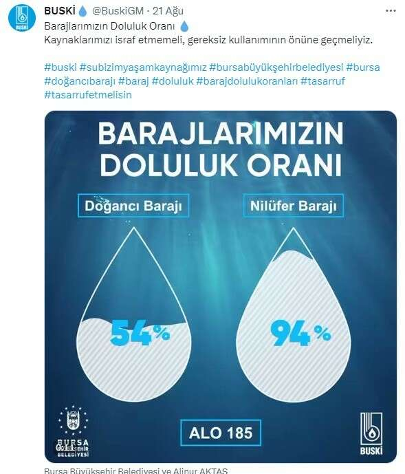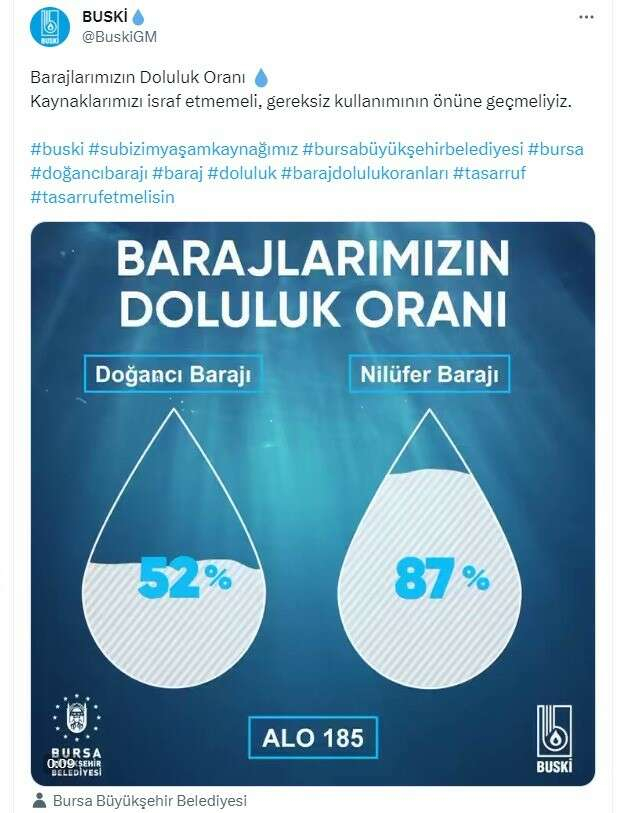 BUSKİ Genel Müdürlüğü, sosyal medya hesaplarından yaptığı paylaşımda Doğancı Barajı'nın doluluk oranının yüzde 52, Nilüfer Barajı'nın doluluk oranının ise yüzde 87 olduğunu belirterek, "Kaynaklarımızı israf etmemeli, gereksiz kullanımın önüne geçmeliyiz" uyarısında bulundu.