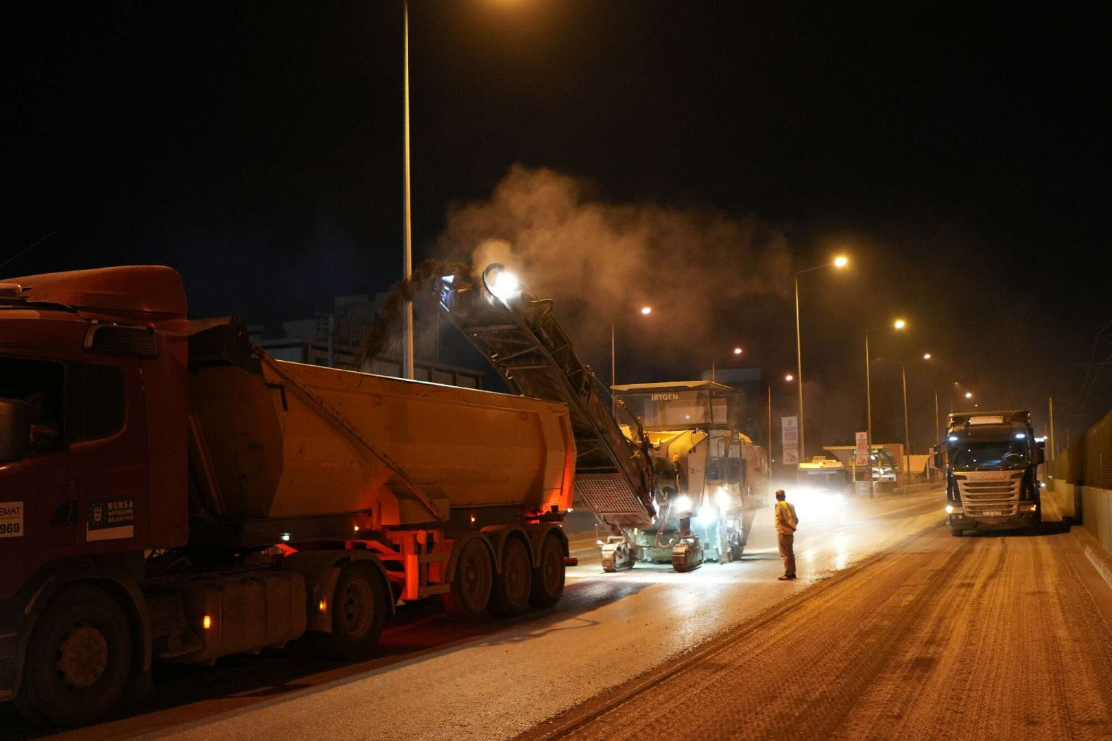 Bursa’da ulaşım sorununa köklü çözümler üretmek amacıyla raylı sistemler, yeni yollar, akıllı kavşaklar ve toplu ulaşım gibi pek çok yatırımı hayata geçiren Büyükşehir Belediyesi, 17 ilçede de mevcut yolları daha sağlıklı hale getirmek için asfalt yenileme çalışmalarına hız verdi. İlçe ve kent merkezlerindeki ana arterlerde trafiğin kesintiye uğramaması için çalışmalar gece boyu sürdürülüyor.