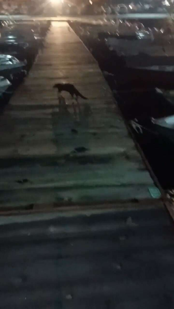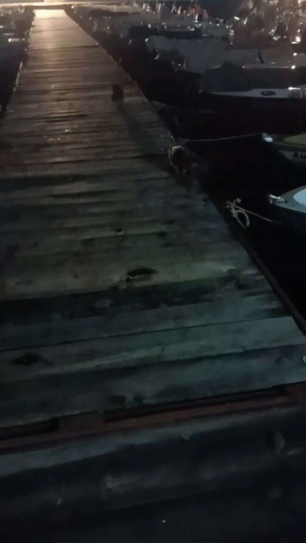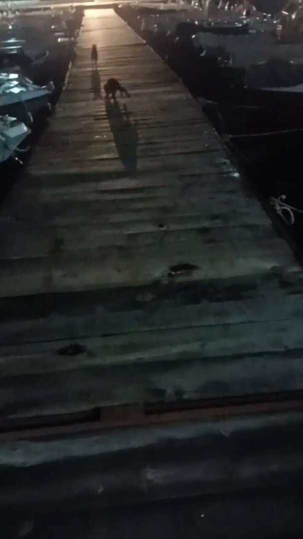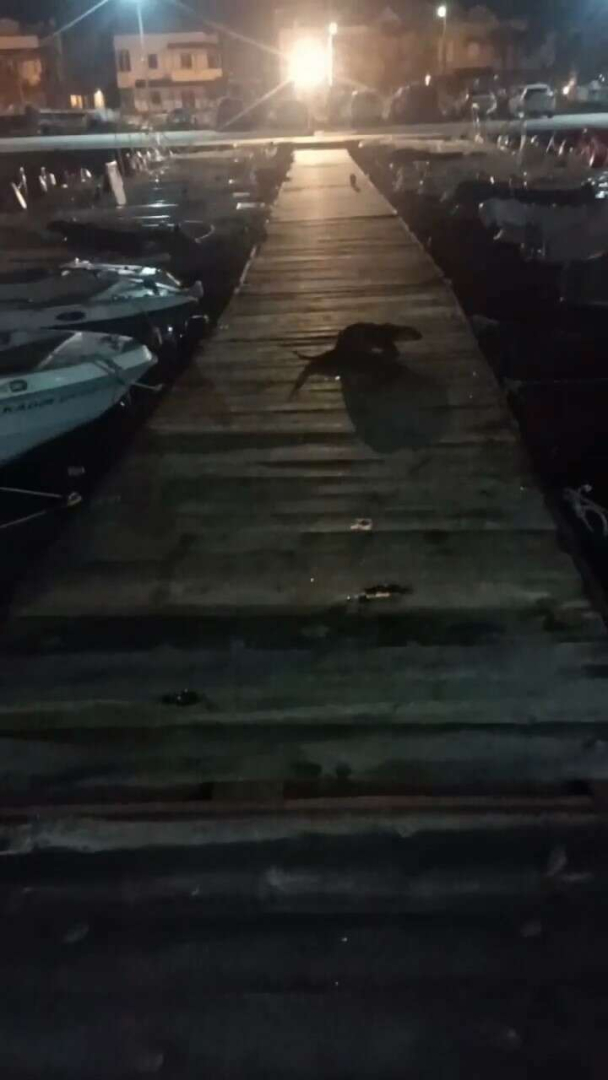 İskelede gördüğü kediyi kovalayan su samuru, renkli görüntüler oluşturdu.