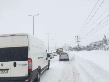 Bursa'da Karacabey-Bandırma yolu yoğun kar yağışı sebebiyle trafiğe kapandı.
