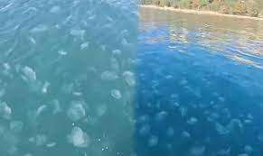 Binlerce denizanası sahili şeridini doldururken, o anlar tekneyle suda ilerleyen balıkçıkların kamerasına yansıdı.