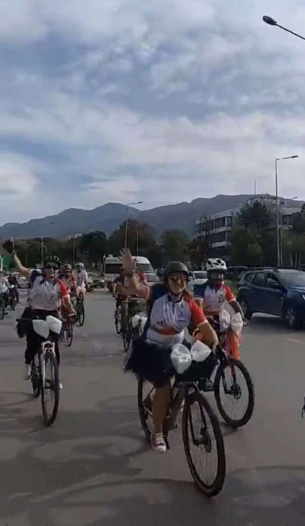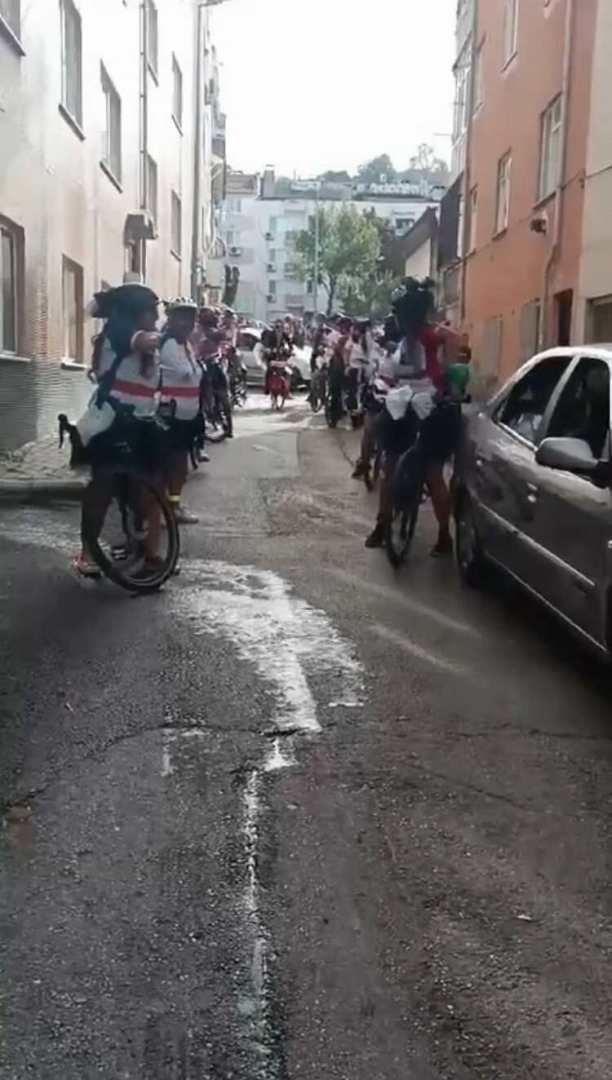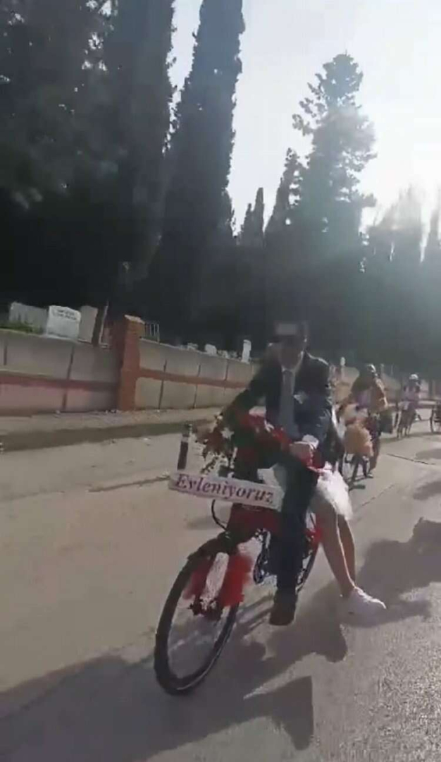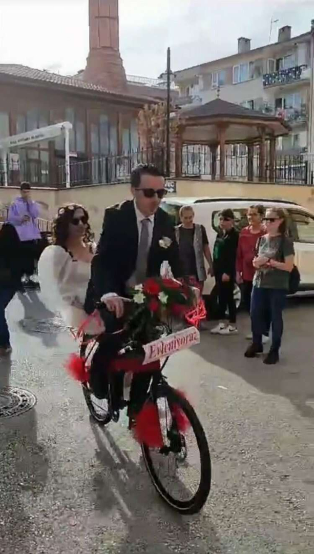 Gizem Akçay’ı alarak bisikletinin arkasına bindiren Mert Koral, bisiklet grubu ile konvoy yapmayı da unutmadı. Konvoyu ve bisikletin üzerindeki gelini görenler meraklı gözlerle izlerken, o anlar cep telefonu ile kaydedilip ölümsüzleştirildi.