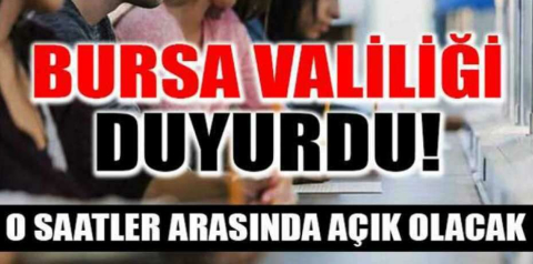 Bursa Valiliğinden yapılan açıklamada, "Dikey Geçiş Sınavına (DGS) katılacak adayların, T.C. kimlik kartı başvuru işlemleri için ilimiz Nilüfer ve Osmangazi İlçe Nüfus Müdürlükleri 03/07/2022 Pazar günü 07:00-11:00 saatleri arasında açık bulundurulacaktır. Kamuoyuna saygıyla duyurulur." ifadelerine yer verildi.