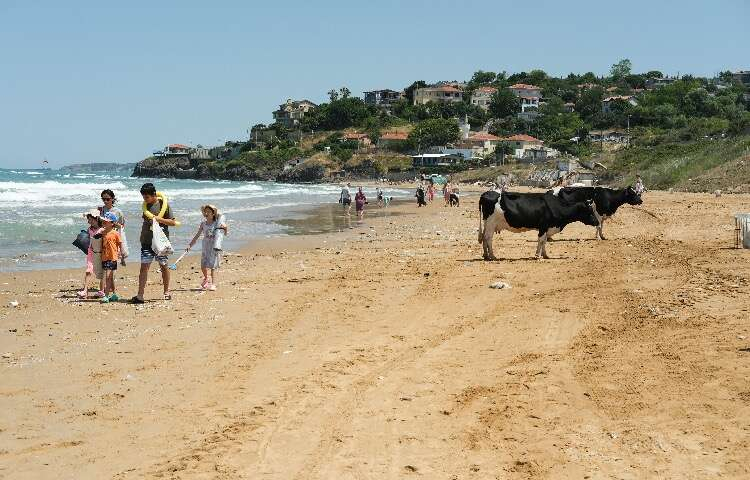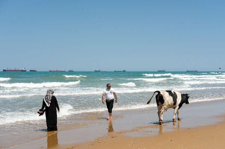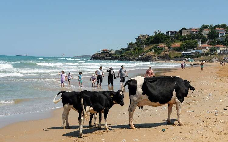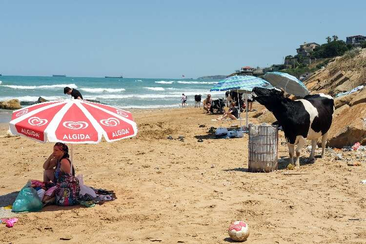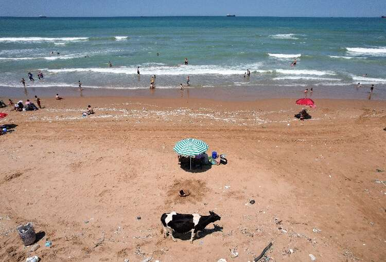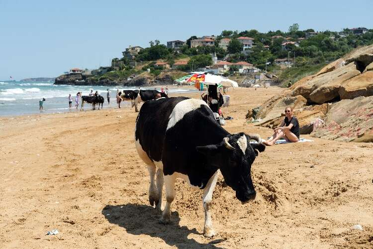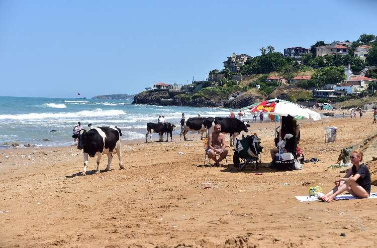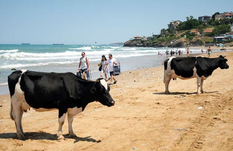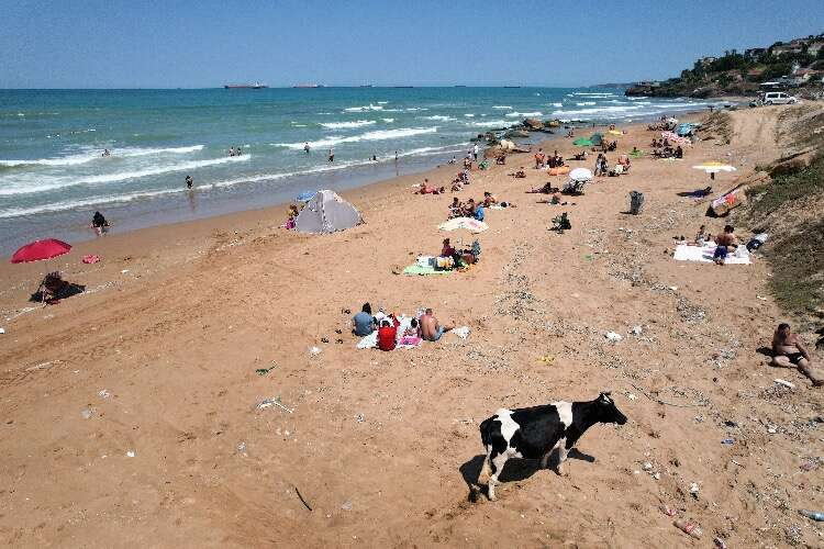 İstanbul’da aşırı sıcaklardan bunalan inekler Kilyos Kısırkaya Halk Plajı’nda vatandaşlarla aynı denizde serinledi.