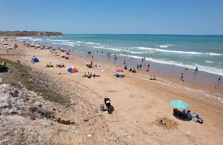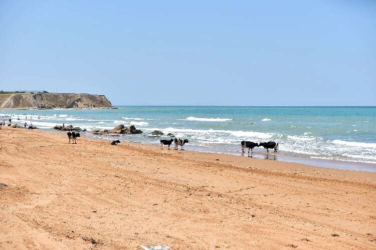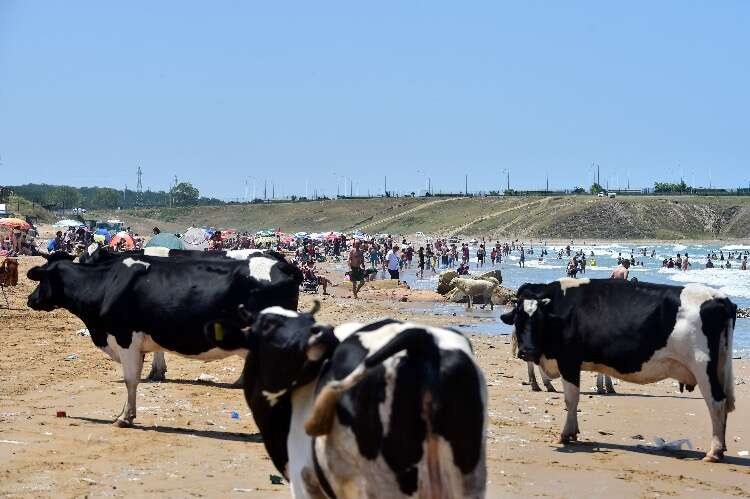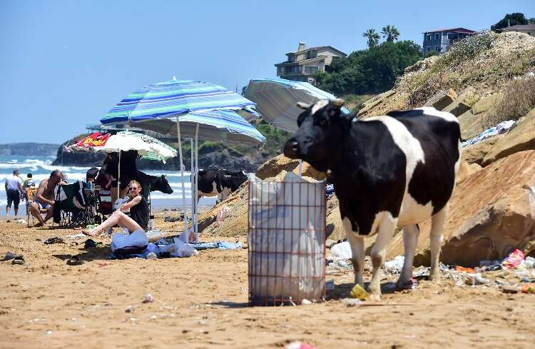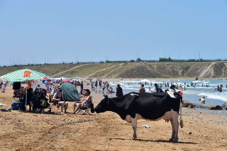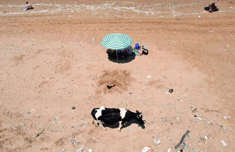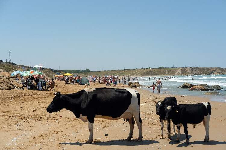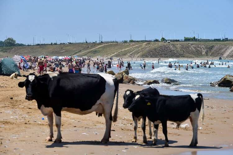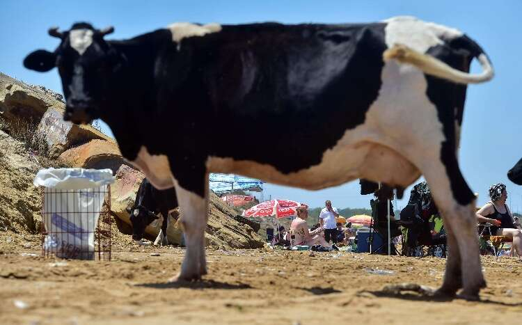 İstanbul’da aşırı sıcaklardan bunalan inekler Kilyos Kısırkaya Halk Plajı’nda vatandaşlarla aynı denizde serinledi.