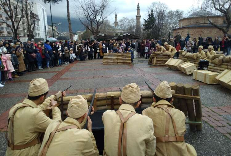 Bursa Büyükşehir Belediyesi’nin Çanakkale Deniz Zaferi’nin 108’inci yılı etkinlikleri kapsamında Çanakkale platosuna dönüştürülen UNESCO Meydanı’nda düzenlediği alanda cephede yaşananların sergilendiği tiyatral gösteri, vatandaşlar tarafından büyük bir gururla izledi.