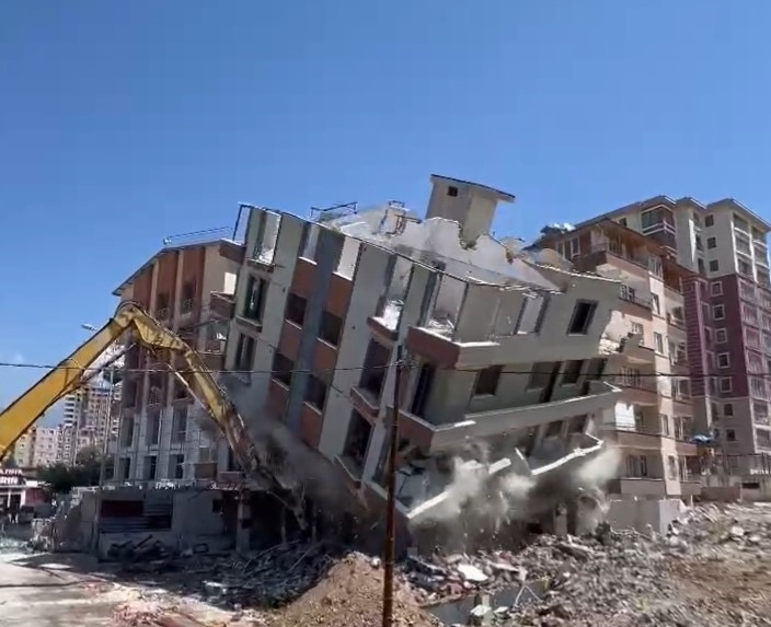 6 katlı bina iş makinesinin darbesiyle yerle bir oldu