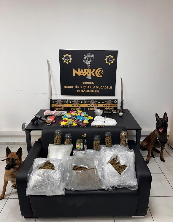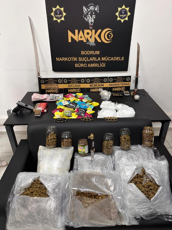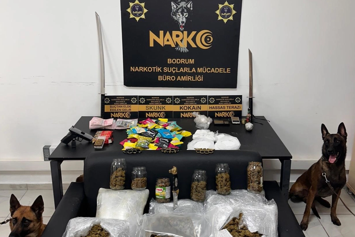 Muğla'nın Bodrum ilçesinde Özel Harekat polisi eşliğinde 6 adrese düzenlenen uyuşturucu operasyonunda 7 kişi gözaltına alınırken, çok miktarda uyuşturucu madde ele geçirildi.