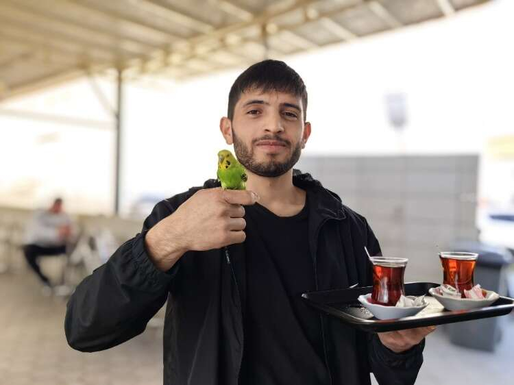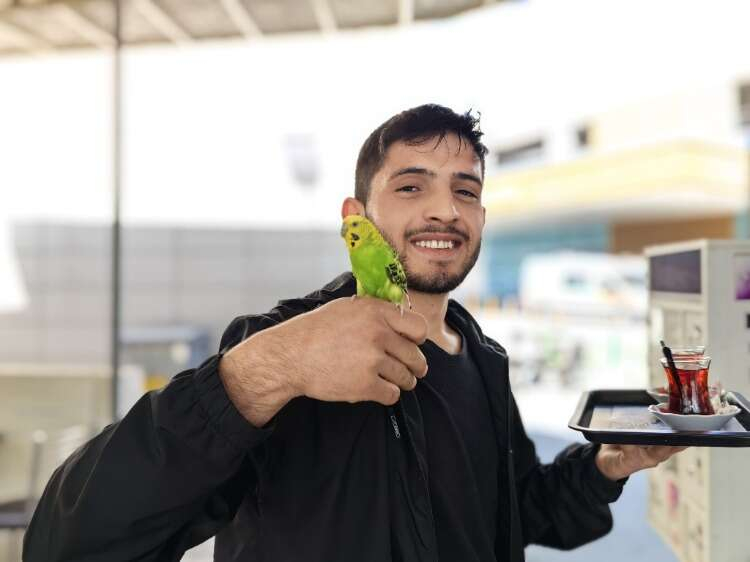 Bursa'nın İnegöl ilçesinde hastane kantininde çalışan gencin 'İbiş' ismini verdiği muhabbet kuşu, bir an bile sahibinin omzundan ayrılmıyor.