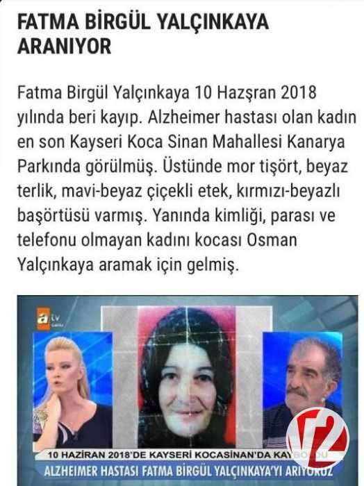 10 Haziran 2018`de Osman Yalçınkaya, polis merkezine giderek 54 yaşındaki 3 çocuk annesi eşi Fatma Birgül Yalçınkaya`nın evinin önündeki parkta otururken kaybolduğunu, eşinin psikolojik rahatsızlığının bulunduğunu ve unutkan olduğunu söyledi.